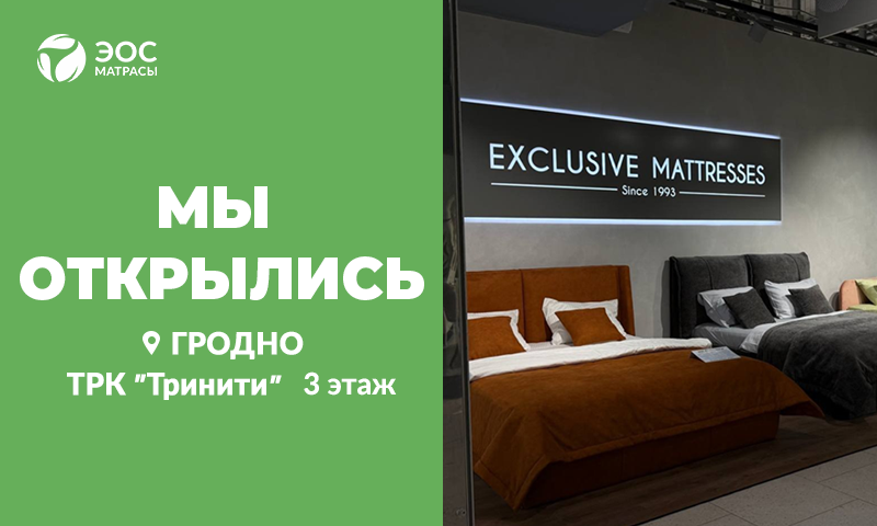 У НАС ПРИЯТНО ПОКУПАТЬ 33 ГОДА С ВАМИ Столько лет мы производим матрасы для Вас СЕРТИФИКАТЫ Вся наша продукция имеет сертификаты качества АКЦИИ и СКИДКИ Приобретайте наши товары по сниженной цене РАССРОЧКА На все товары действует рассрочка до 8 месяцев! БЕСПЛАТНАЯ ДОСТАВКА Доставим Ваш заказ от 300 р. БЕСПЛАТНО! ГАРАНТИЯ На пружинный блок даём гарантию 5 ЛЕТ! 33 года с Вами Акции Скидки Расссрочка Сертификаты качества Гарантия на пружинный блок Бесплатная доставка Популярные Категории Матрасы Наматрасники Топперы Одеяла Подушки Кровати Корпусная мебель Лидеры Продаж Кредит 4%Хит продаж Добавить к сравнению Быстрый просмотр Добавить в Избранное Матрас ЭОС Премьер Тип 9bНагрузка: 150 кгВысота: 21 смЖесткость: Высокая/Средняя Оценка 5.00 из 5 от 464,58 BYN Подробнее Этот товар имеет несколько вариаций. Опции можно выбрать на странице товара. Добавить к сравнению Быстрый просмотр Добавить в Избранное Подушка ЭОС Фея Оценка 5.00 из 5 от 33,38 BYN Подробнее Этот товар имеет несколько вариаций. Опции можно выбрать на странице товара. Добавить к сравнению Быстрый просмотр Добавить в Избранное Подушка ЭОС Гевея Оценка 5.00 из 5 от 46,74 BYN Подробнее Этот товар имеет несколько вариаций. Опции можно выбрать на странице товара. -10%Кредит 4% Добавить к сравнению Быстрый просмотр Добавить в Избранное Матрас ЭОС Идеал Тип 6aНагрузка: 130 кгВысота: 21 смЖесткость: Высокая/Средняя Оценка 4.95 из 5 от 374,96 BYN337,46 BYN Подробнее Этот товар имеет несколько вариаций. Опции можно выбрать на странице товара. -26%Кредит 4% Добавить к сравнению Быстрый просмотр Добавить в Избранное Матрас ЭОС Идеал Тип 1a/2Нагрузка: 120 кгВысота: 18 смЖесткость: Низкая/Средняя Оценка 4.97 из 5 от 263,73 BYN216,26 BYN Подробнее Этот товар имеет несколько вариаций. Опции можно выбрать на странице товара. -15%Кредит 4% Добавить к сравнению Быстрый просмотр Добавить в Избранное Матрас ЭОС Идеал Тип 2Нагрузка: 110 кгВысота: 18 смЖесткость: Низкая/Средняя Оценка 4.96 из 5 от 263,25 BYN223,76 BYN Подробнее Этот товар имеет несколько вариаций. Опции можно выбрать на странице товара. -10%Кредит 4%Подушка в подарок* Добавить к сравнению Быстрый просмотр Добавить в Избранное Матрас ЭОС Элит Тип 9aНагрузка: 150 кгВысота: 23 смЖесткость: Высокая/Средняя Оценка 5.00 из 5 от 678,90 BYN658,04 BYN Подробнее Этот товар имеет несколько вариаций. Опции можно выбрать на странице товара. -10%Кредит 4% Добавить к сравнению Быстрый просмотр Добавить в Избранное Матрас ЭОС Идеал Тип 8Нагрузка: 130 кгВысота: 21 смЖесткость: Средняя Оценка 5.00 из 5 от 366,05 BYN329,45 BYN Подробнее Этот товар имеет несколько вариаций. Опции можно выбрать на странице товара. -19%Кредит 4% Добавить к сравнению Быстрый просмотр Добавить в Избранное Матрас ЭОС Аспект Тип 7aНагрузка: 130 кгВысота: 20 смЖесткость: Низкая/Средняя Оценка 4.95 из 5 от 389,10 BYN345,73 BYN Подробнее Этот товар имеет несколько вариаций. Опции можно выбрать на странице товара. Кредит 4%Рекомендуем Добавить к сравнению Быстрый просмотр Добавить в Избранное Матрас ЭОС Премьер Тип 5aНагрузка: 150 кгВысота: 21 смЖесткость: Средняя Оценка 4.86 из 5 от 489,59 BYN Подробнее Этот товар имеет несколько вариаций. Опции можно выбрать на странице товара. -15% Добавить к сравнению Быстрый просмотр Добавить в Избранное Наматрасник защитный ЭОС «Свежесть» Оценка 5.00 из 5 от 77,49 BYN65,87 BYN Подробнее Этот товар имеет несколько вариаций. Опции можно выбрать на странице товара. Добавить к сравнен